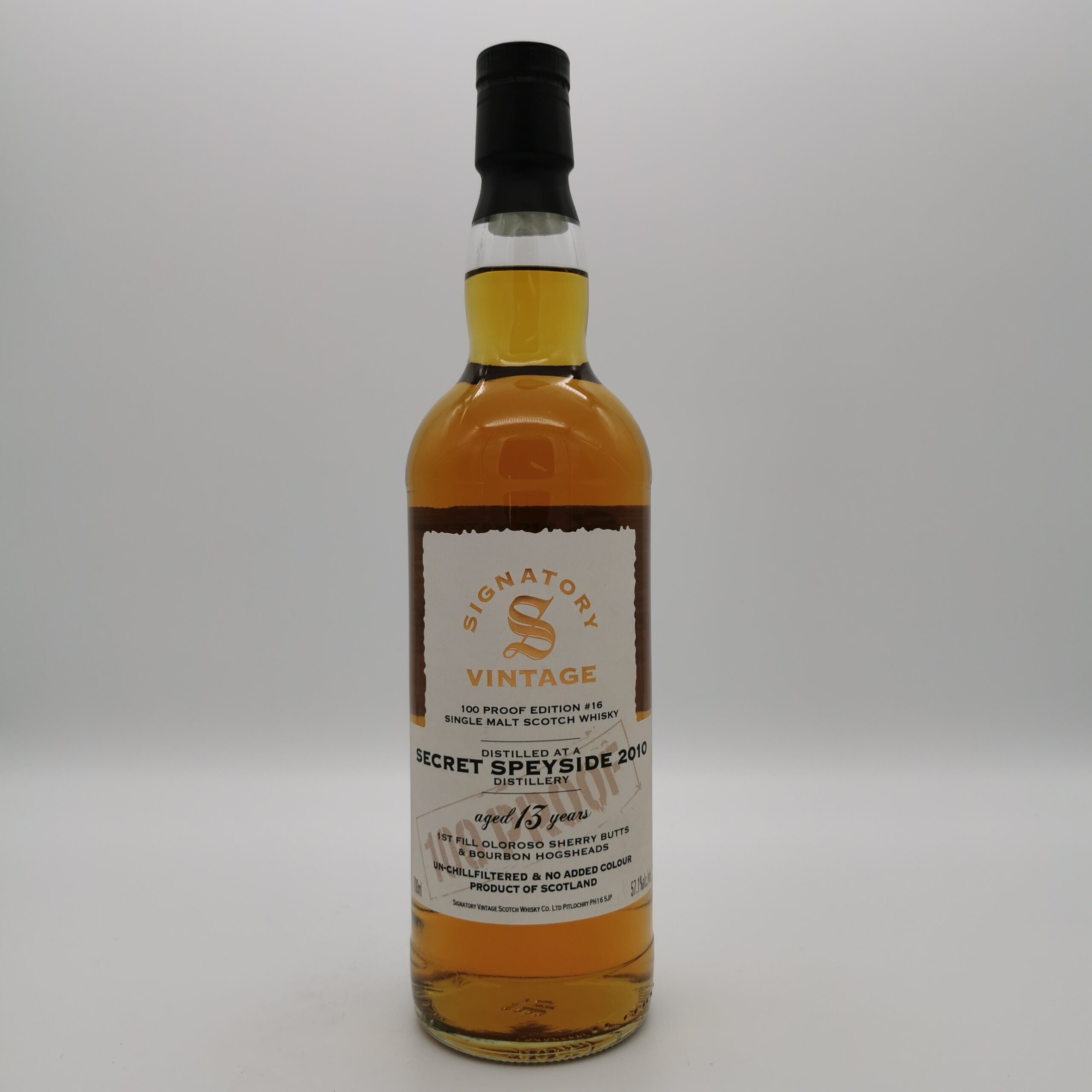 Dieser 13-jährige Secret Speyside 2010/2024 wurde vom unabhängigen Abfüller Signatory Vintage in der neuen 100 Proof Edition abgefüllt. Mit 57,1% vol., dem Mindestgehalt, ab dem mit Alkohol getränktes Schießpulver entzündet werden kann, in elegante Flaschen gebracht, schließt die Reihe eine Lücke im Signatory-Sortiment. Dieser Secret Speyside reifte im 1st Fill Oloroso Sherry Butt & Bourbon Hogshead zu einem gelungenen Speysider.