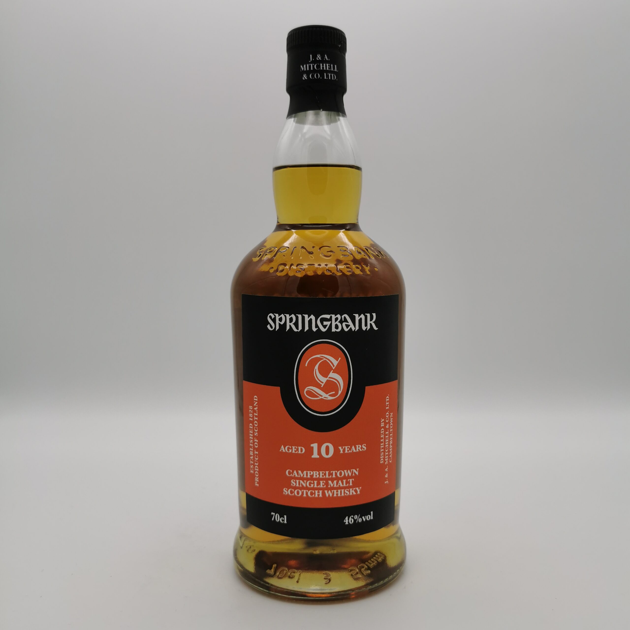 Dieser Springbank 10 Jahre gehört zur Standartrange und reifte für mindestens 10 Jahre in ehemaligen Sherry- und Ex-Bourbon-Fässern. Der Whisky wird zweieinhalbfach destilliert und ist eine Mischung aus zwei- und dreifach gebranntem Rohwhisky. Er ist ein Paradebeispiel für den komplexen Stil der Brennerei.