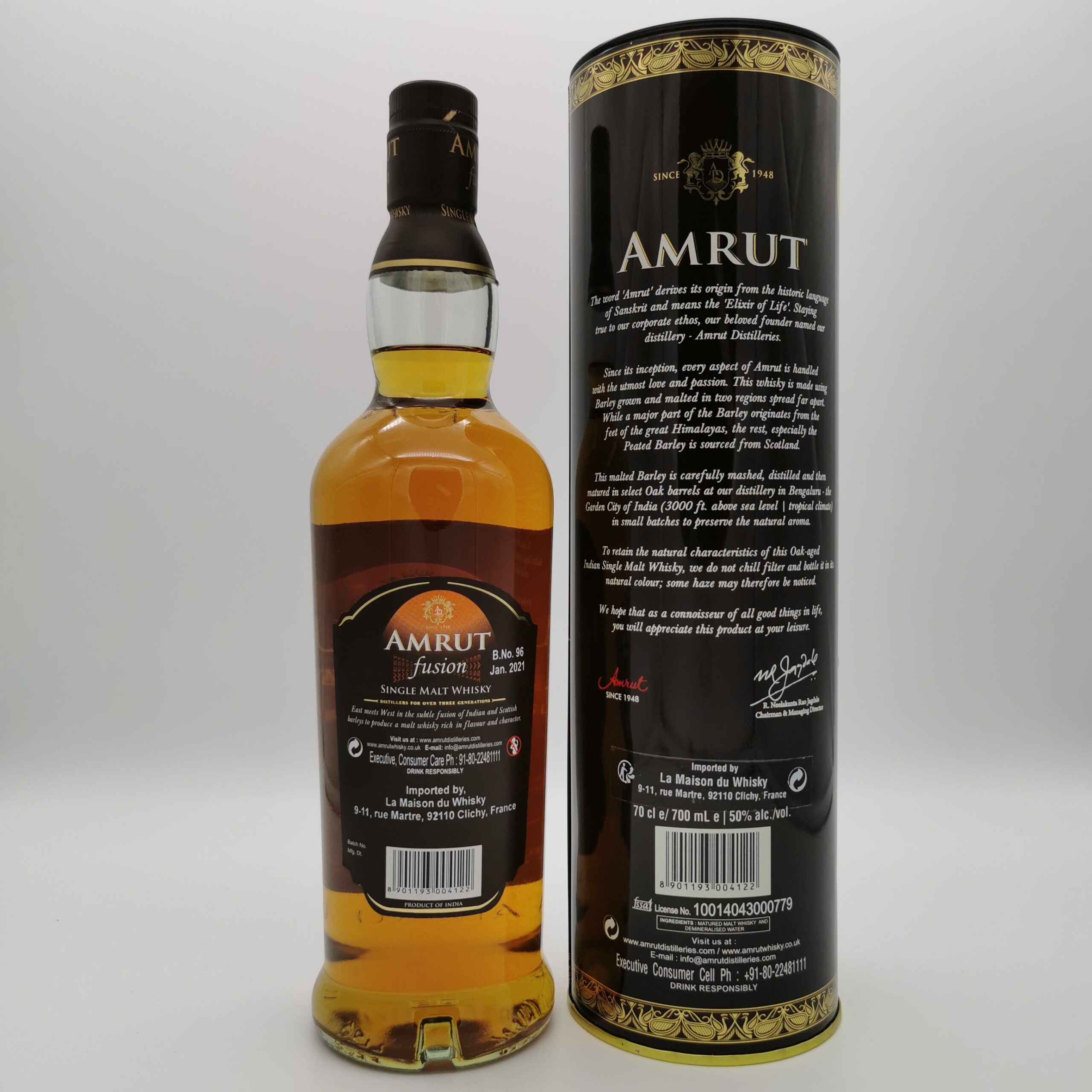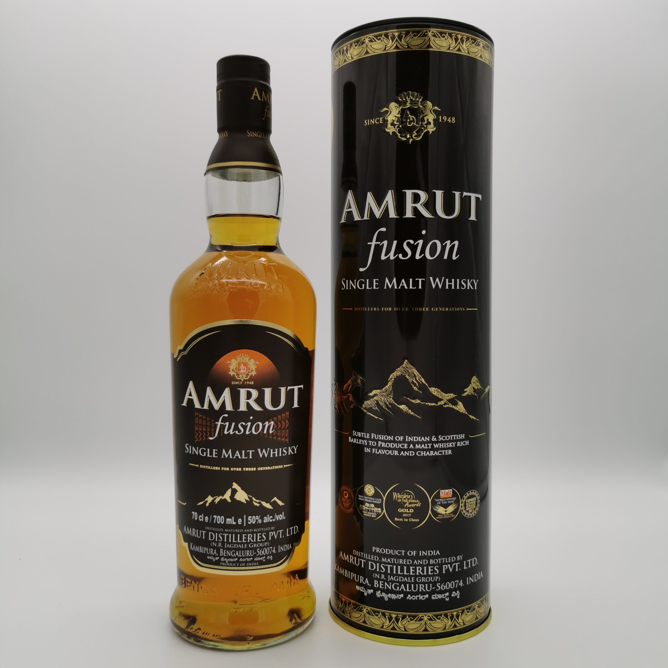 Die Amrut Brennerei hat die Wurzeln unmittelbar nach Ende der englischen Kolonialherrschaft 1948, als die Inder begannen, ihren eigenen Whisky zu brennen. Hoch über dem Meeresspiegel in Bangalore reifen die Destillate unter tropischen Bedingungen rund 3-4 mal schneller als in Schottland. Dadurch haben die Whiskys von Amrut bereits mit 3 bis 5 Jahren einen so hohen Reifungsgrad dass sie abgefüllt werden können.