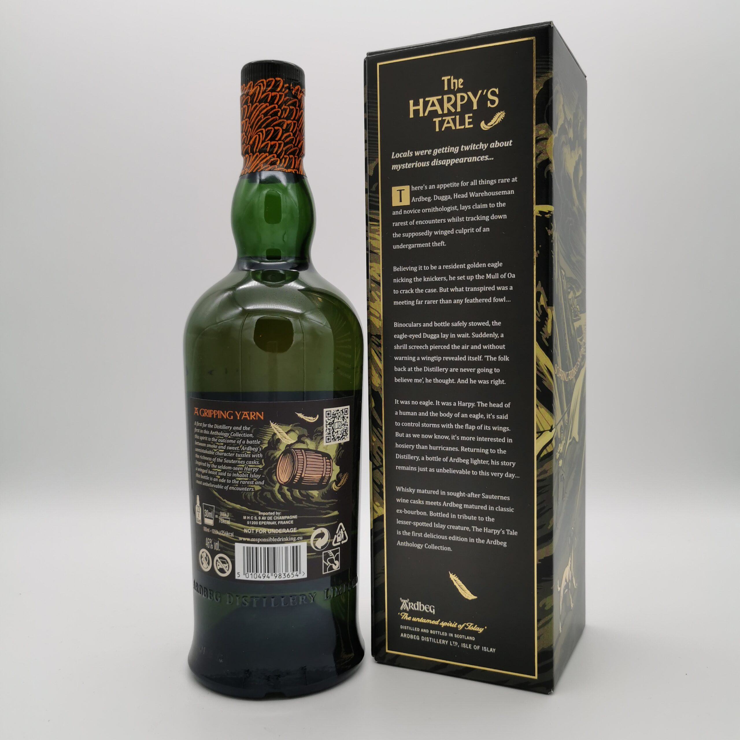 Die seltene Harpyie – ein Fabelwesen, halb Mensch, halb Vogel – inspirierte die Erstauflage der Destillerie. „The Harpy’s Tale“ reifte 13 Jahre in raren französischen Sauternes Süßweinfässern und ist mit Ardbeg aus klassischen Ex-Bourbon-Fässern vermählt. Nach über einem Jahrzehnt im Fass geht der aufsteigende Rauch in Süße über, während sich der unverwechselbare Charakter von Ardbeg mit dem reichen Ausdruck der Sauternes Süßweinfässer mischt. Eine überragende, kräftige Abfüllung… ultimativ aromatisch und genauso sensationell wie ihre Geschichte.