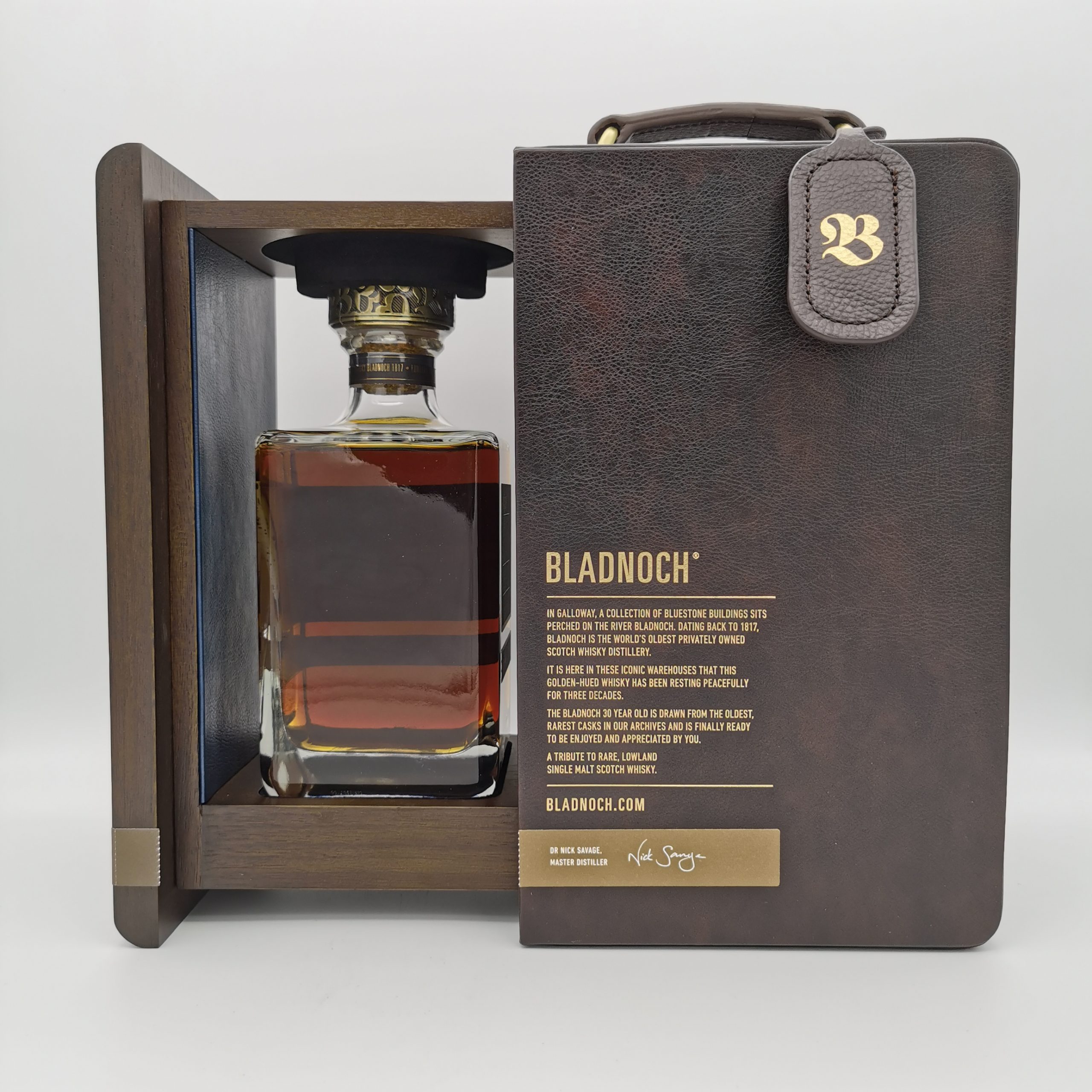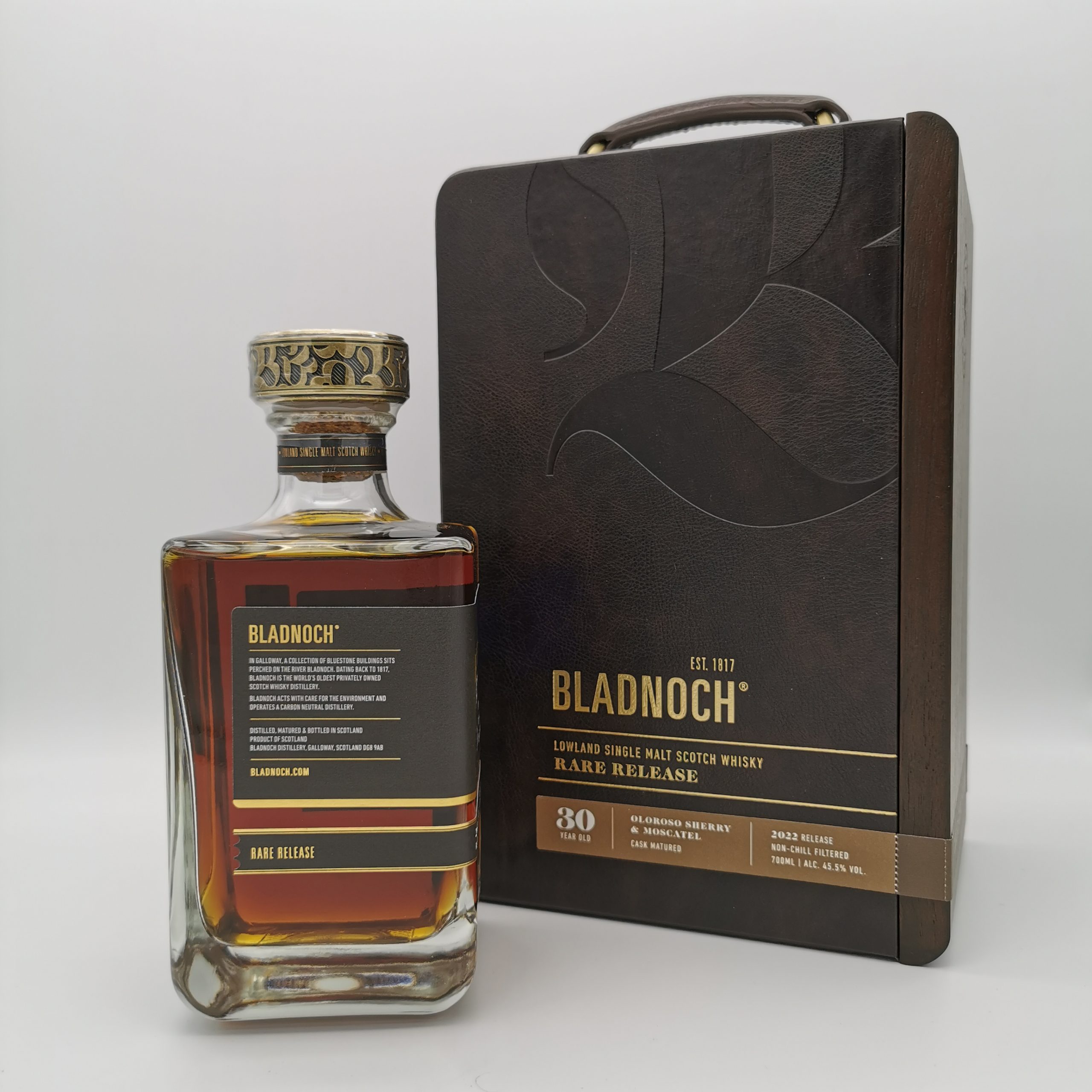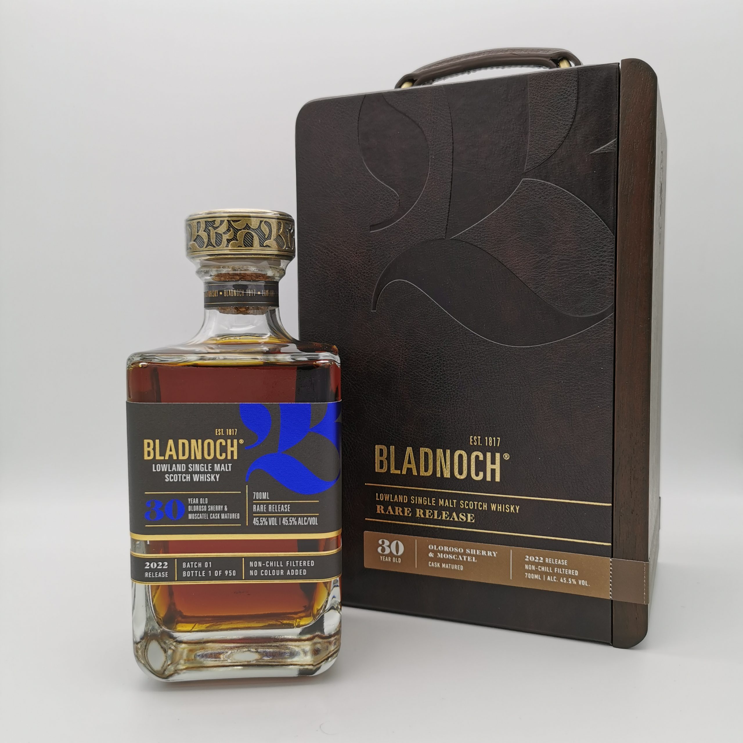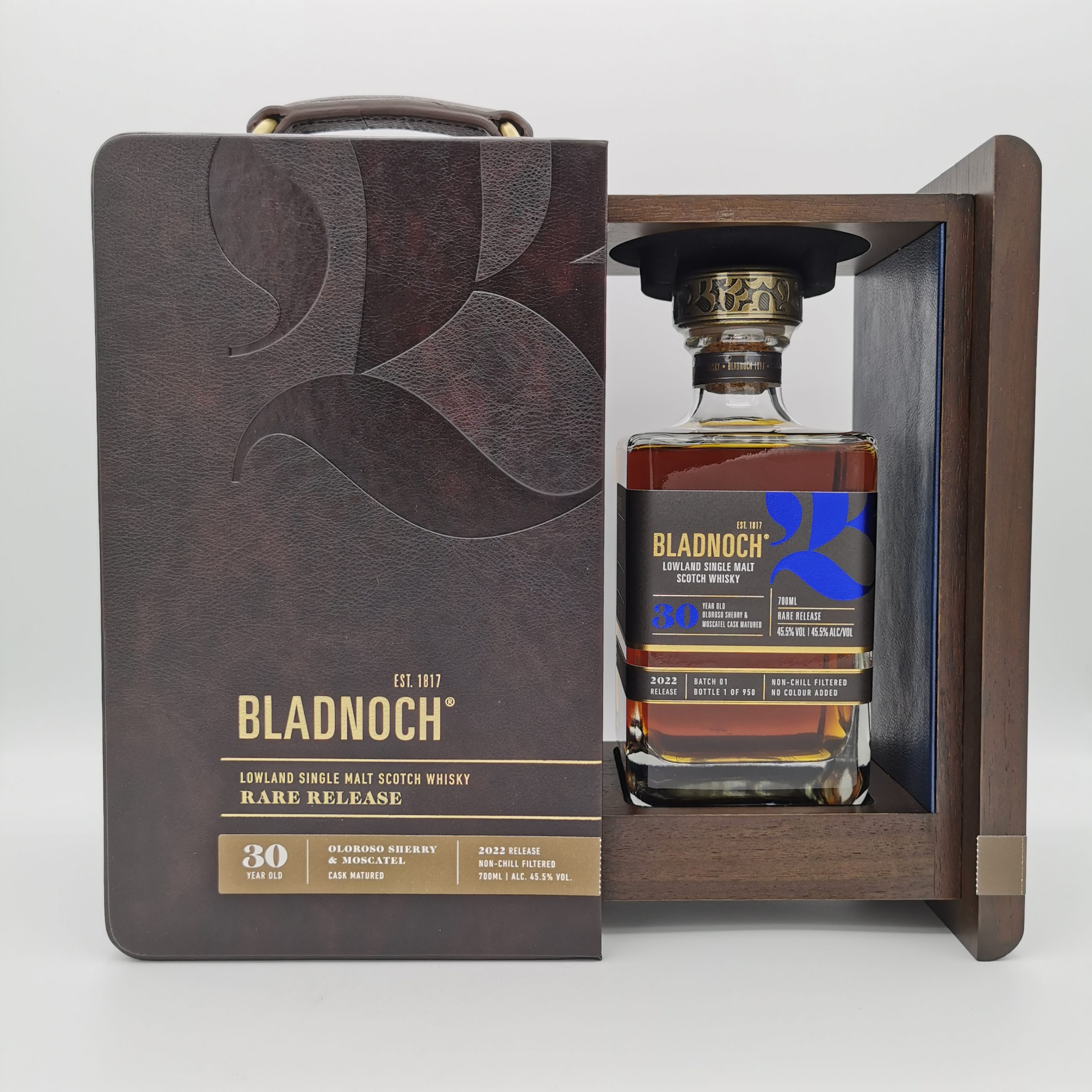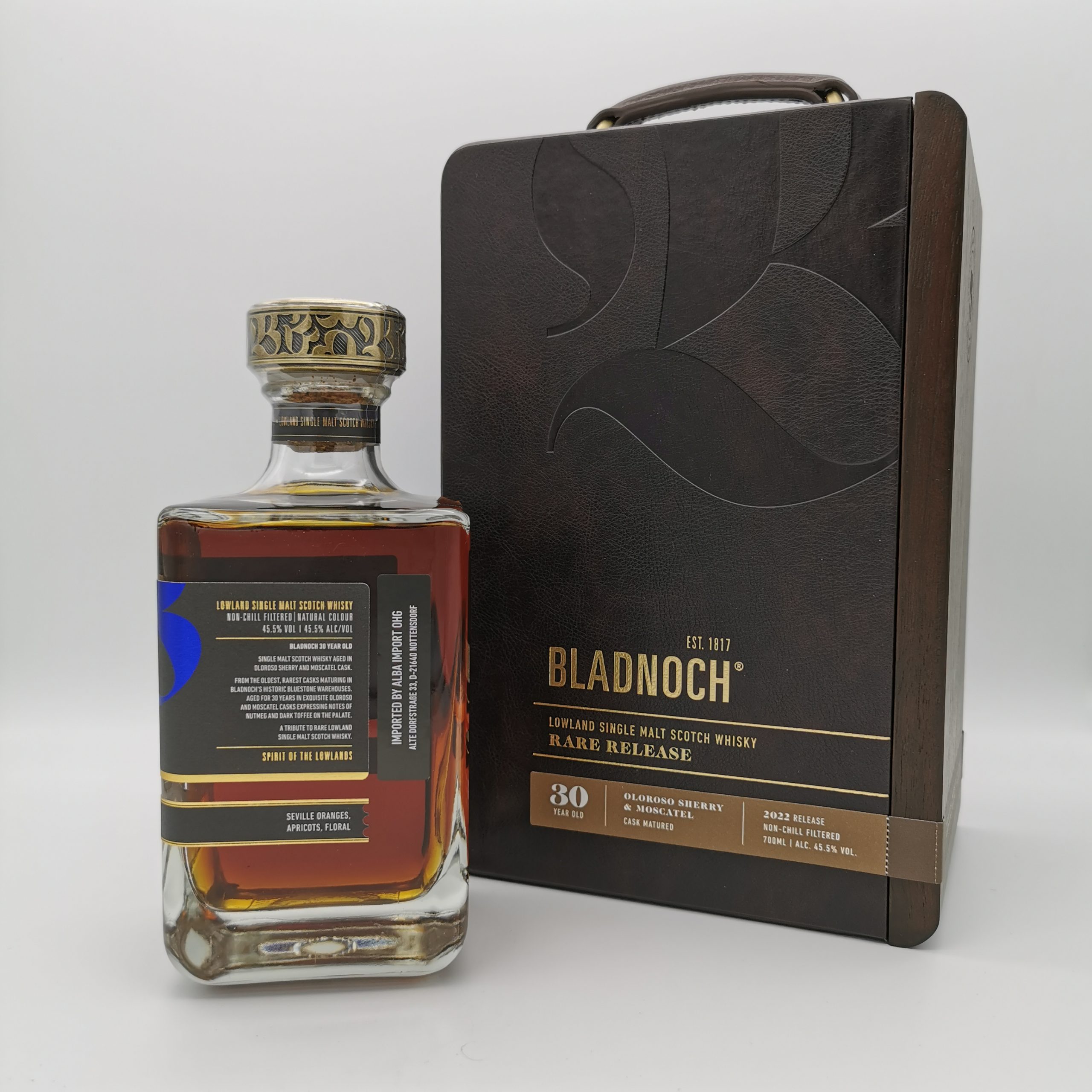 Dieser Bladnoch 30 Jahre ist die bisher älteste Abfüllung der Destillerie. Mit 30 Jahren Reifung, in Oloroso Sherry und Mosacatel-Fässern, stammt dieser Single Malt noch von den Vor-Vorbesitzern der Brennerei, die Bladnoch 1993 schlossen und schließlich verkauften. Die Vorräte von Fässern aus der Zeit vor 1993 sind äußerst gering und so handelt es sich beim 30-jährigen Bladnoch in der Tat um eine „Rare Release“ und einen wahren Schatz aus den Warehouses von Bladnoch!