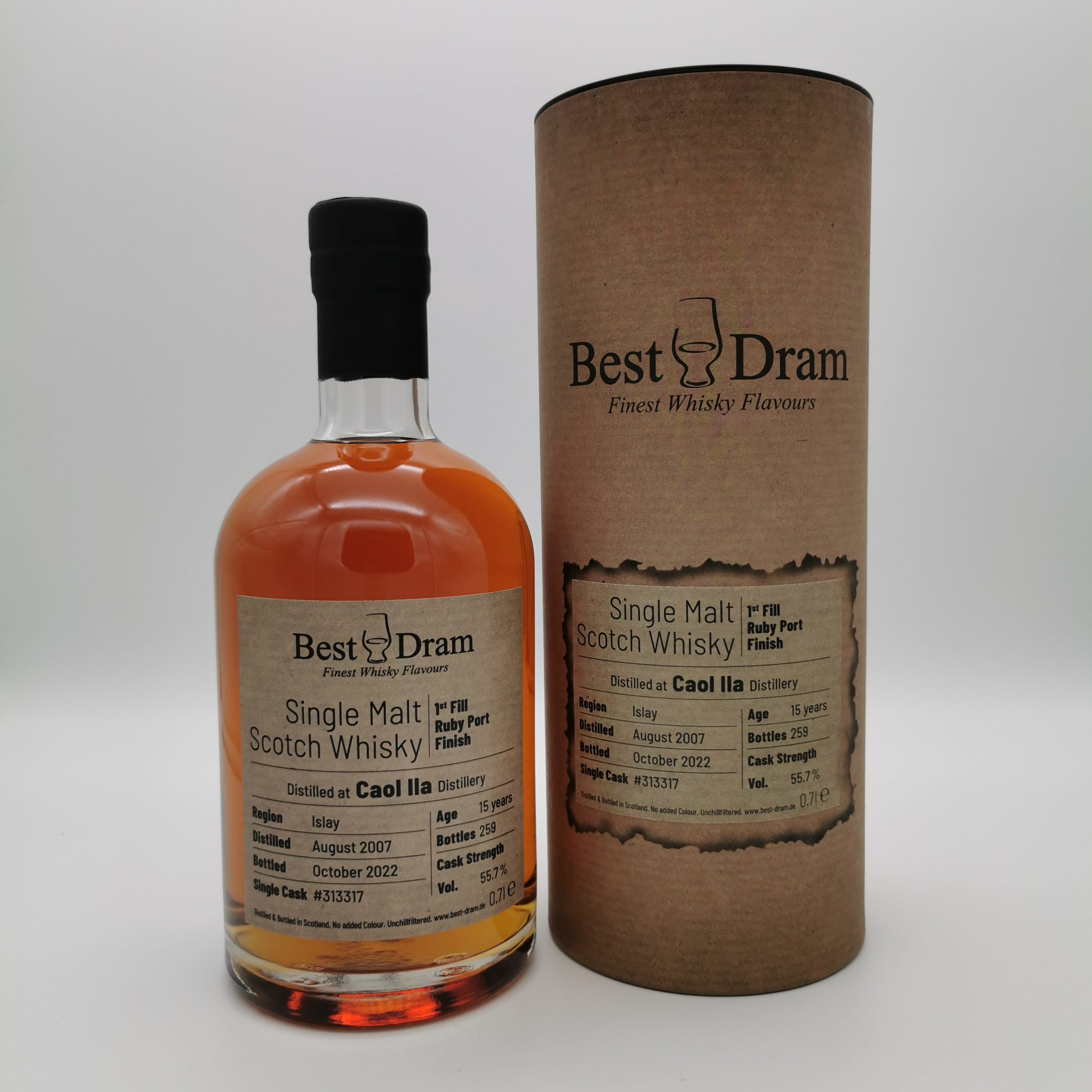 Dieser 15-jährige Caol Ila wurde 2007 destilliert und erhielt ein Finish im 1st Fill Ruby Port Cask #313317. Dieser Malt überzeugt mit süßen Trauben, Pflaumen und Gewürzen.