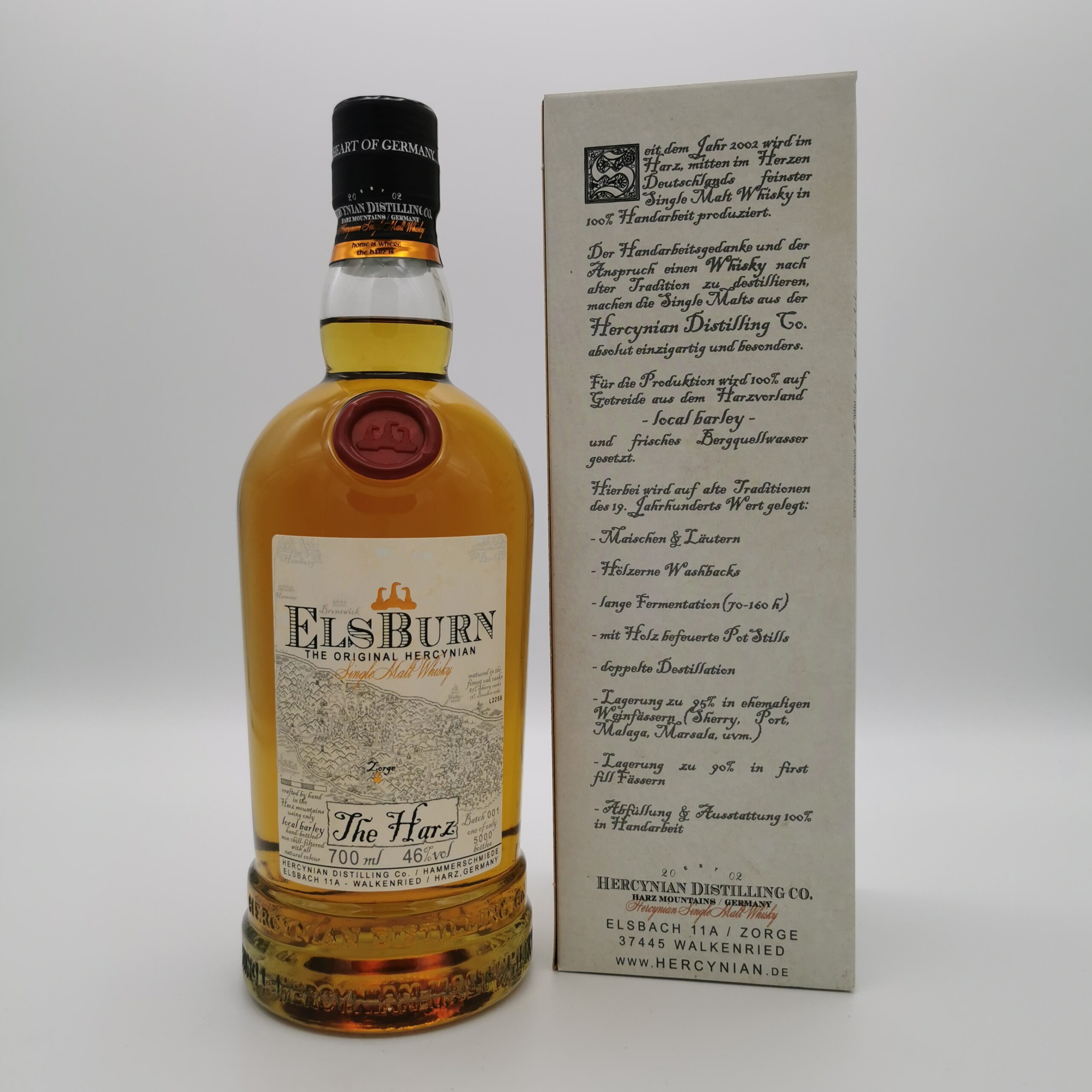 ElsBurn The Harz wird zu 100 Prozent aus regionaler Gerste destilliert und ist nun ein weiterer Standard der Brennerei. Durch die Reifung in First und Second Fill Sherry Hogsheads sowie einem geringen Anteil an First Fill Bourbon Barrels betont der Single Malt den Destilleriecharakter – und zwar noch stärker als bei The Journey oder der Distillery Edition.