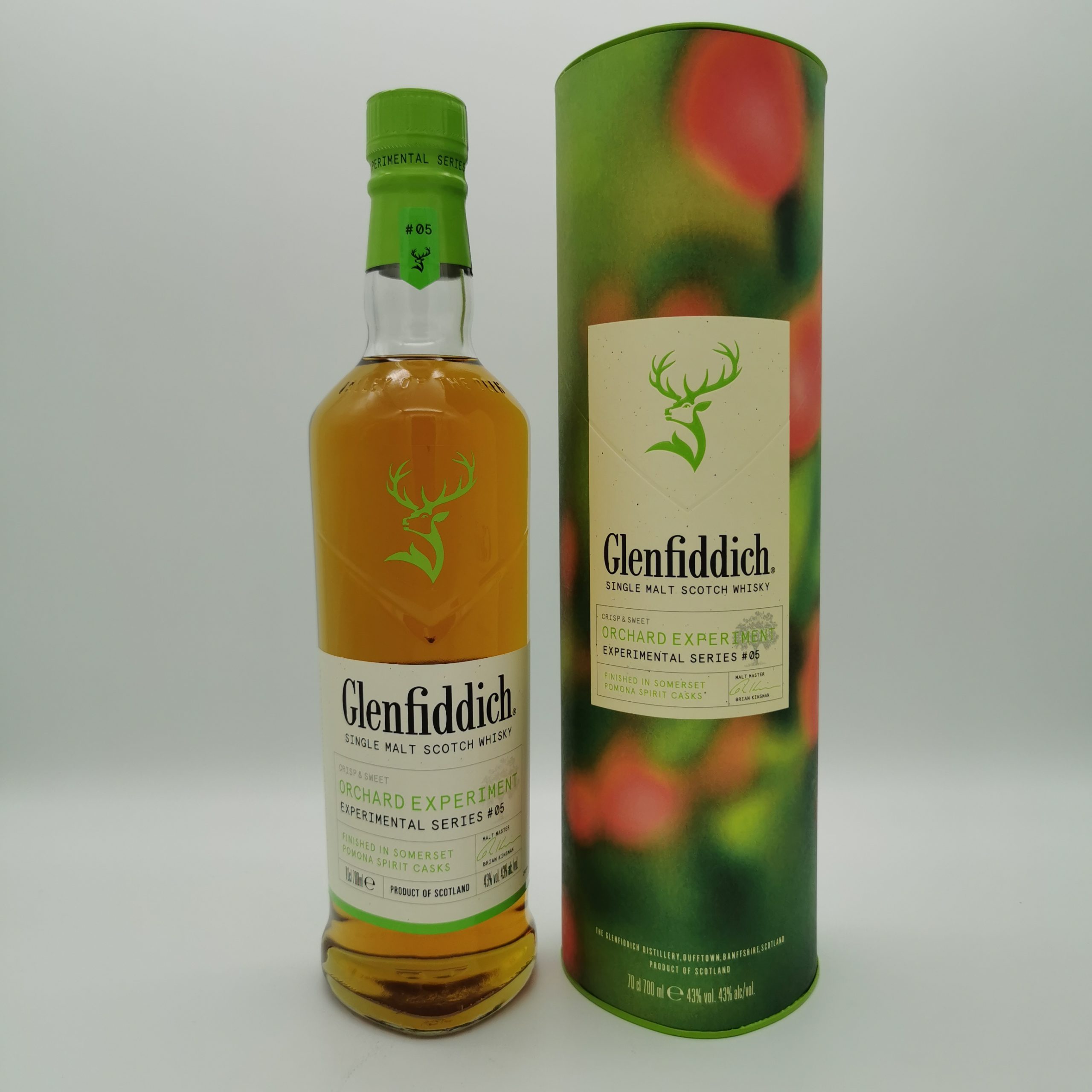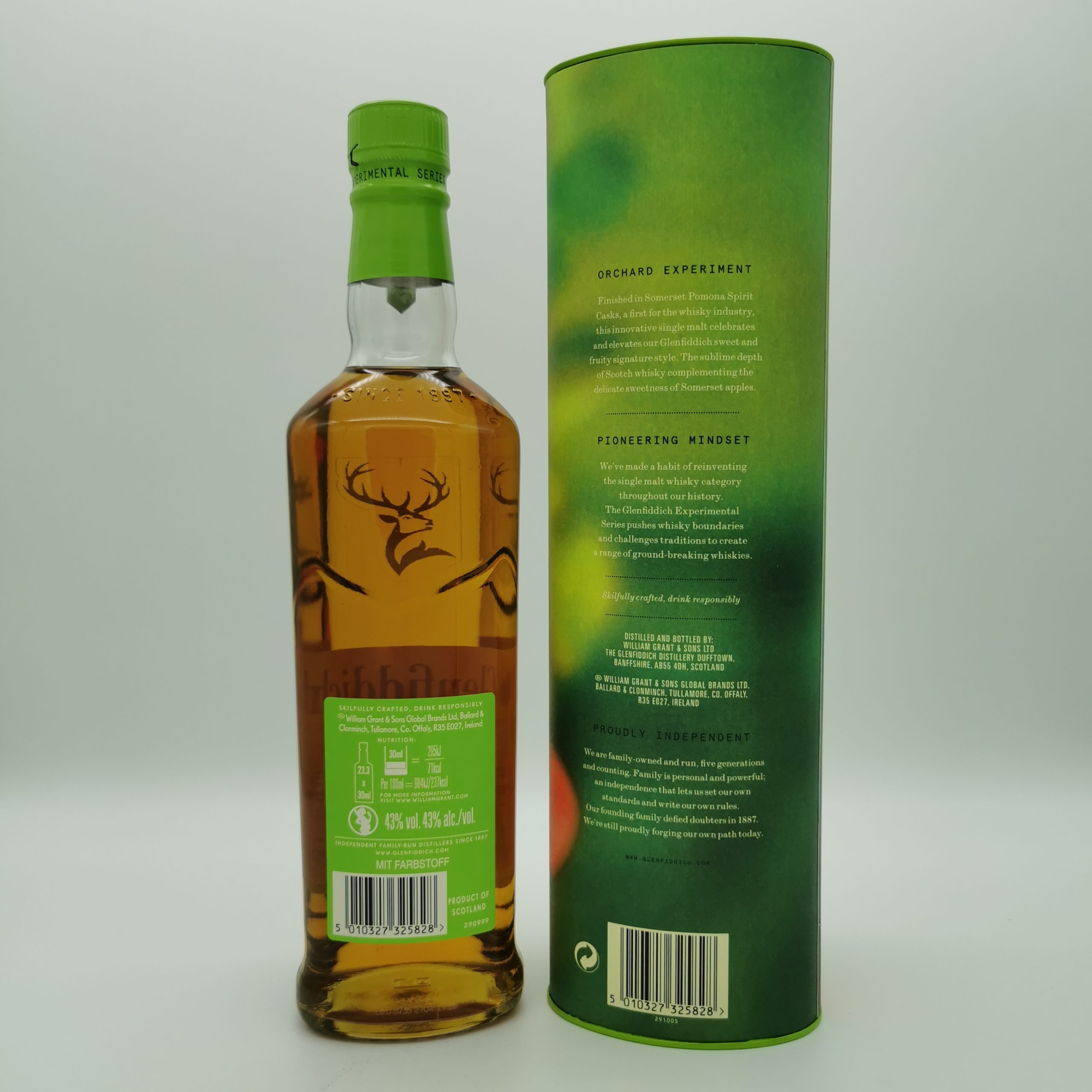 Vorab ausgewählte Glenfiddich-Whiskys wurden für ca. 4 Monate in Fässern des Familienbetriebs The Somerset Cider Brandy Co. nachgereift, die zuvor süßen Pomona enthielten. Somerset Pomona ist ein Apfellikör. Die geheime Mischung aus dem frisch gepressten Saft feinster Äpfel und Somerset Cider-Brandy reift für 2 Jahre in Eichenfässern. Eben jene nutzt Glenfiddich für die Veredelung von Orchard Expermient. Das Ergebnis: ein unglaublich fruchtiger und süßer Whisky für die Sommer-Saison.