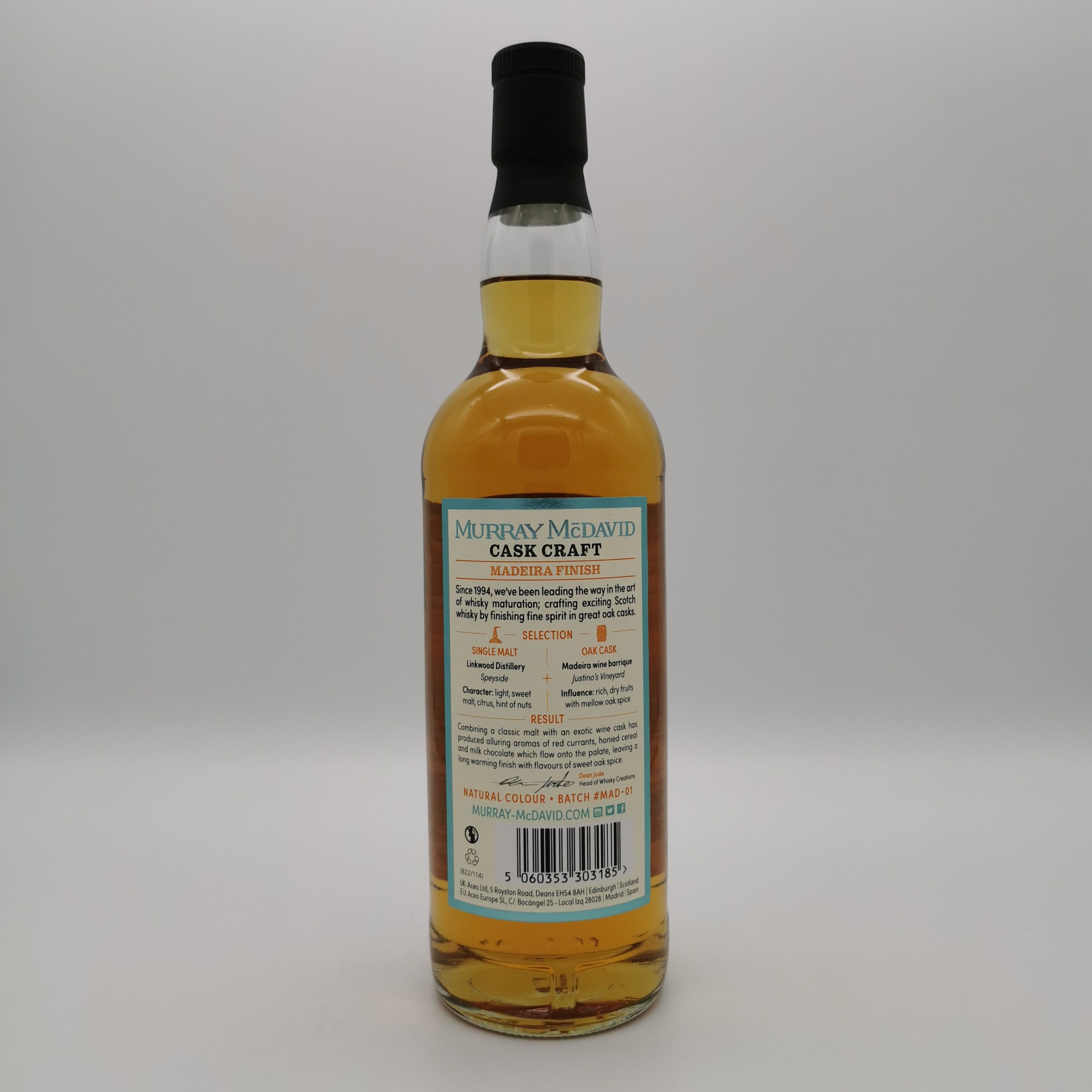 Dieser Linkwood Madaira Cask Finish wurde vom unabhängigen Abfüller Murray McDavid in seiner Cask Craft Serie abgefüllt. Er reifte zuerst in Bourbon Barrels und erhielt dann ein Finish in Madeira Wine Barriques. Das Ergebnis ist ein fruchtig, süßer Single Malt!