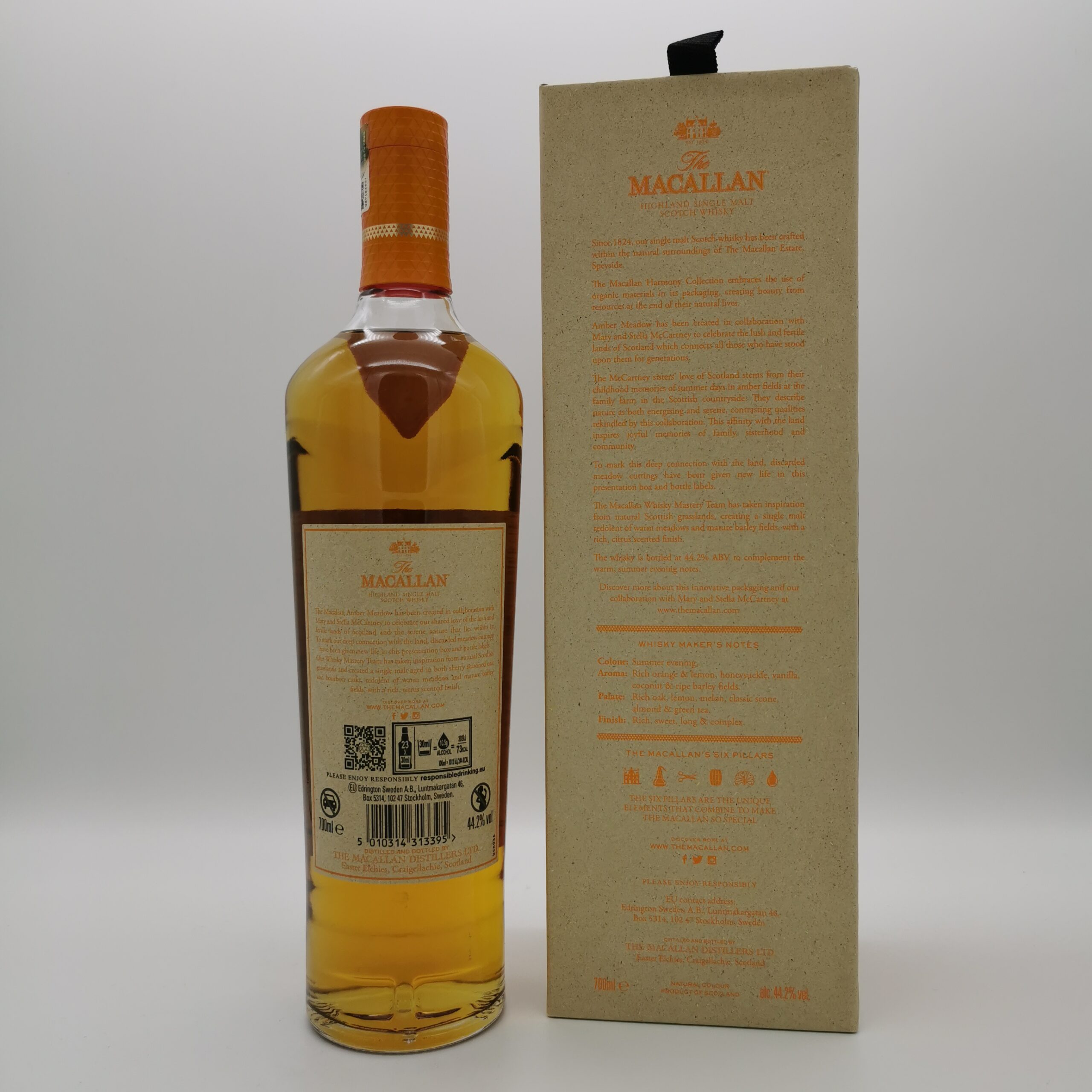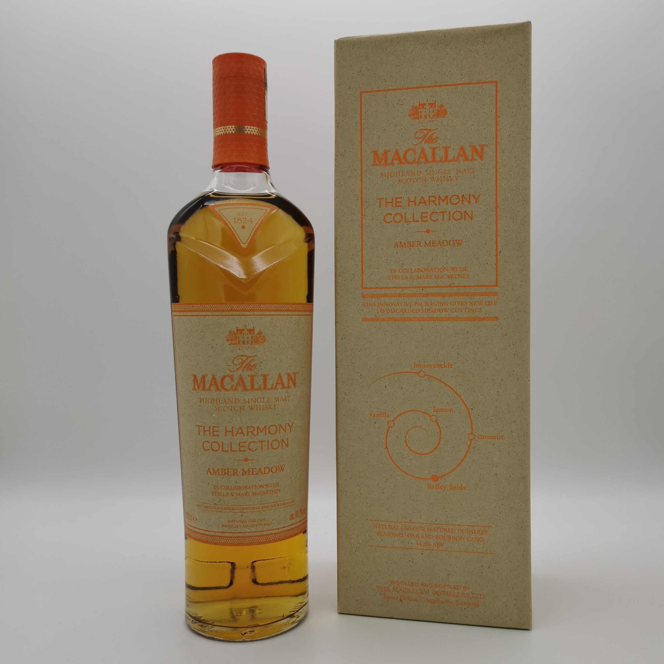 Dieser Macallan Amber Meadow ist eine Limited Edition und ist die dritte Abfüllung der „The Macallan Harmony Collection“. Er wurde in Zusammenarbeit mit Stella und Mary McCartney, den Töchtern des berühmten Musikers der Beatles, kreiert. Diese dritte Abfüllung der Serie ist den schottischen Grasländern gewidmet und in die Verpackung wurde Mähgut von den schottischen Wiesen eingearbeitet. Reifen durfte dieser besondere Single Malt in einer Kombination von besonderen First Fill Bourbon Casks, sowie seasoned Sherryfässern.