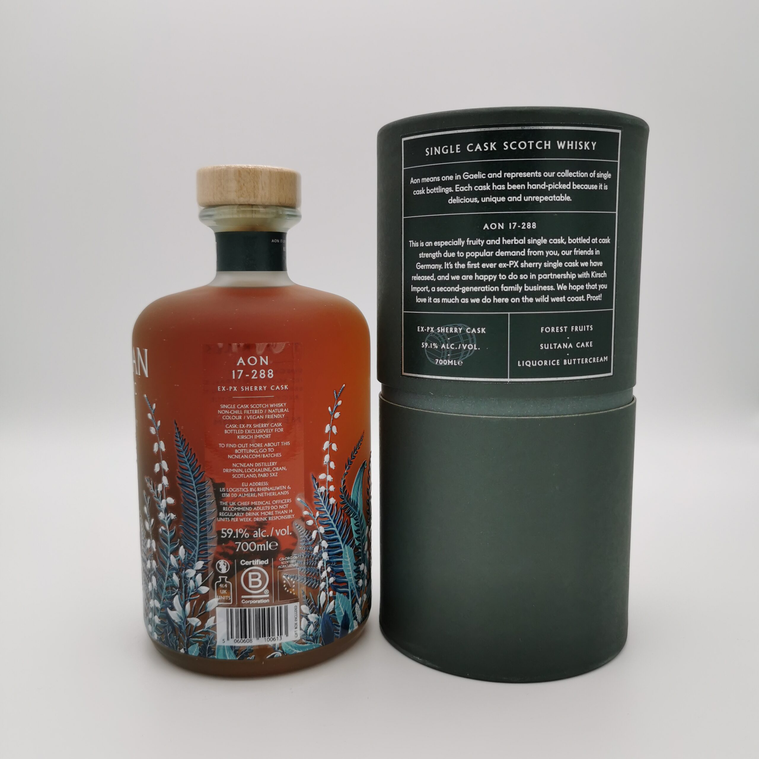 Dieses Nc’nean Aon – PX Sherry Single Cask wurde exklusiv für den deutschen Markt abgefüllt und ist die erste Einzelfassabfüllung der kleinen Highland-Brennerei aus einem Pedro-Ximénez-Sherryfass. Aufgrund der großen Nachfrage aus Deutschland in Fassstärke abgefüllt, entfaltet der siebenjährige Single Malt Noten von Waldfrüchten, Rosinenkuchen, Lakritz und Buttercreme.