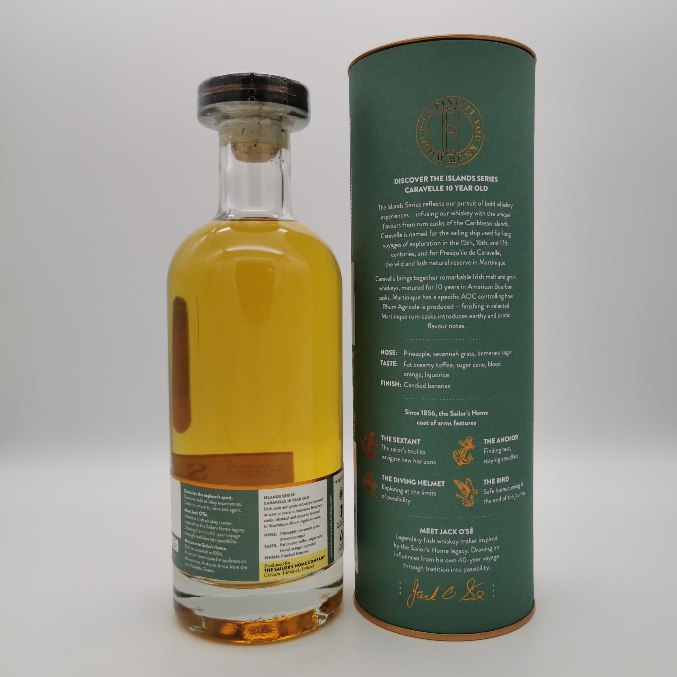Er ist ein hervorragender Blend aus 10 Jahre alten Irish Grain und Irish Single Malt Whiskeys. Er wurde für die „Island Series“ von Sailor’s Home abgefüllt. Zunächst reifte er 10 Jahren in amerikanischen Bourbonfässern und erhielt dann ein Finish in feinen karibischen Martinique Rumfässern.