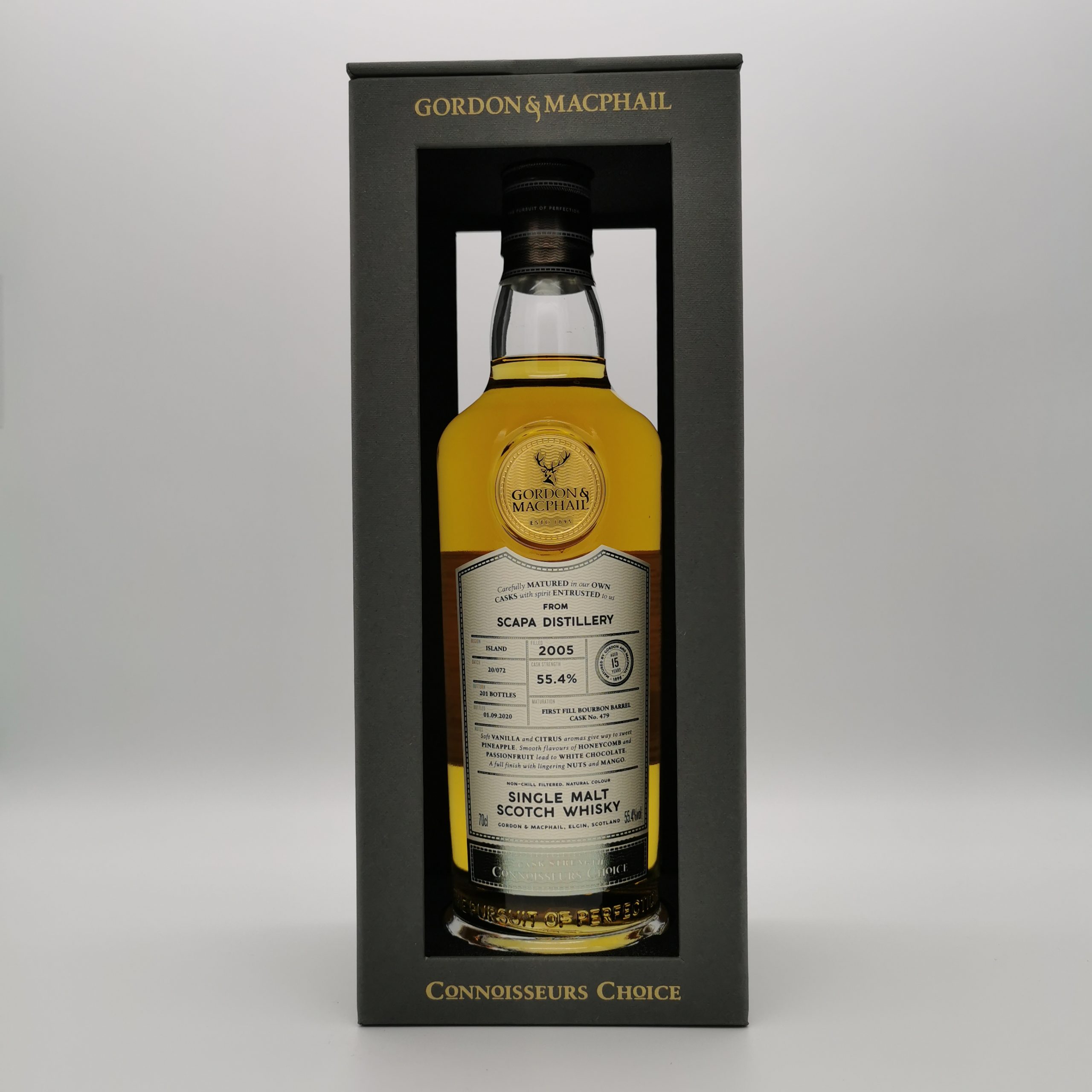 Dieser Scapa 15 Jahre 2005/2020 wurde exklusive für den deutschen Importeur Kirsch Whisky in der Connoisseurs Choice Range von Gordon &MacPhail abgefüllt. Die Abfüllung reifte seine vollen 15 Jahre in einem First Fill Bourbon Barrel.