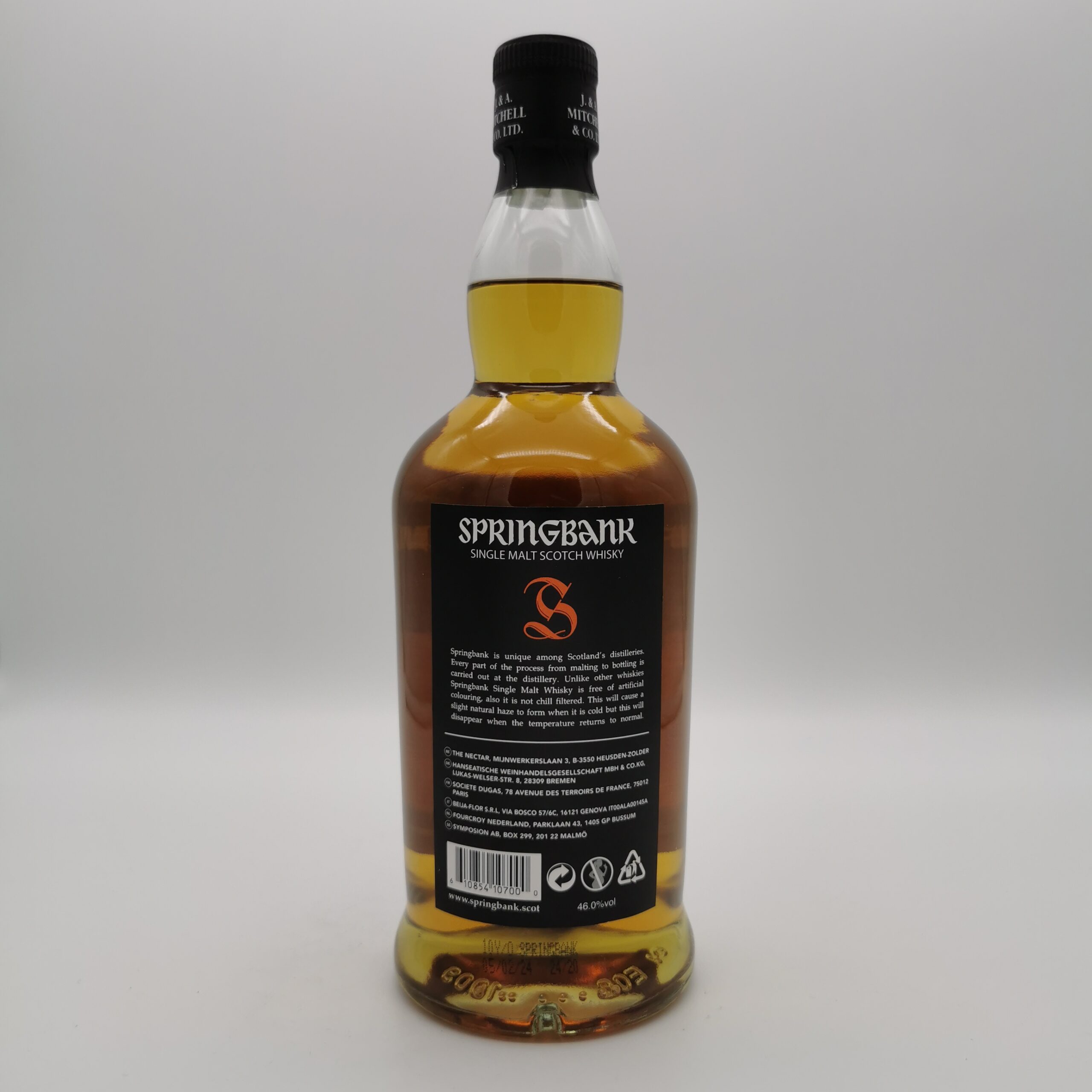 Dieser Springbank 10 Jahre gehört zur Standartrange und reifte für mindestens 10 Jahre in ehemaligen Sherry- und Ex-Bourbon-Fässern. Der Whisky wird zweieinhalbfach destilliert und ist eine Mischung aus zwei- und dreifach gebranntem Rohwhisky. Er ist ein Paradebeispiel für den komplexen Stil der Brennerei.