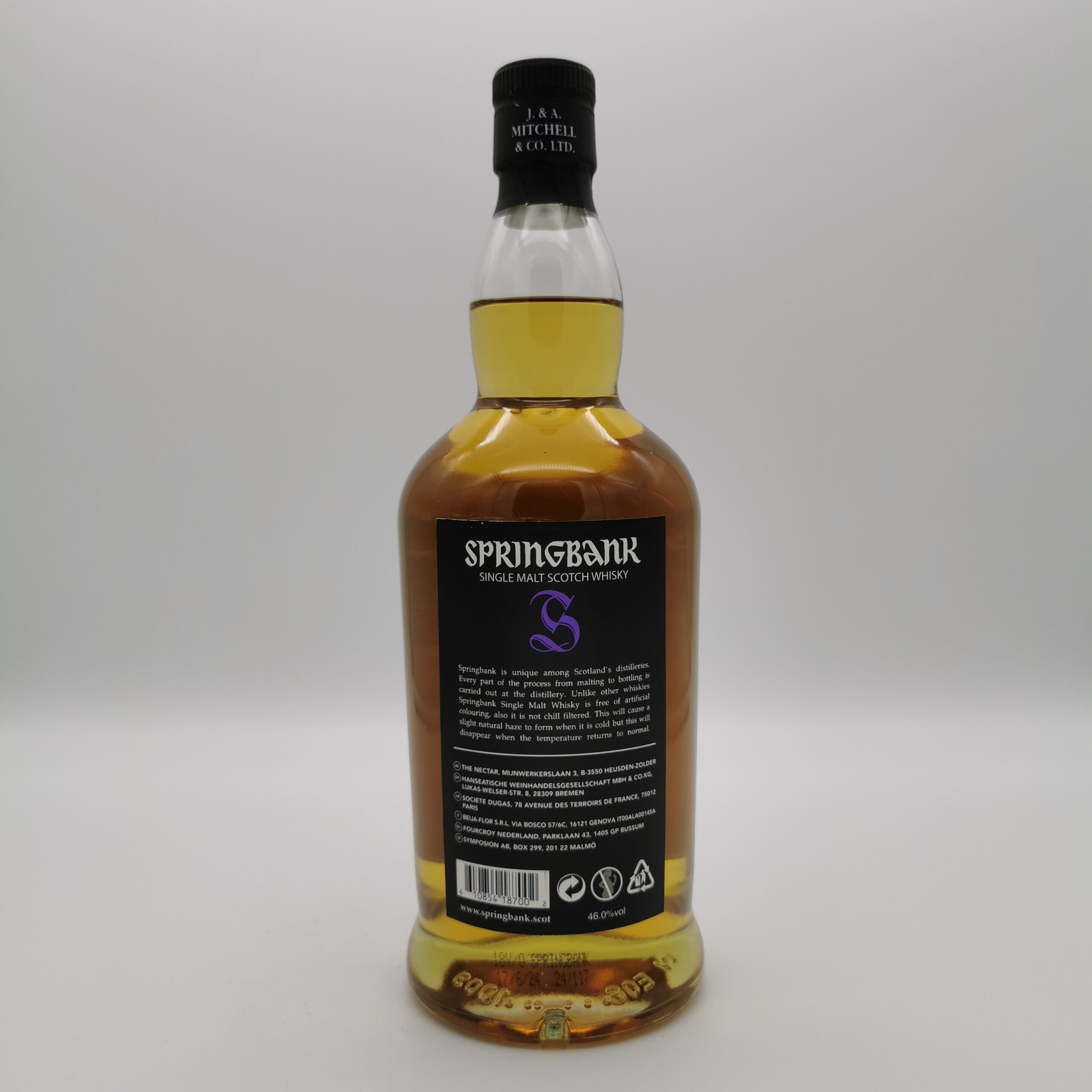 Die Springbank Destillerie ist eine Whiskybrennerei aus Campbeltown auf dem südlichen Teil der Halbinsel Kintyr. Die Brennerei wurde im Jahre 1828 durch die Familie Reid gegründet. Seit dem Jahr 1837 ist die Brennerei im Besitz der Familie Mitchell und hat sich ihre Unabhängigkeit bis heute bewahrt. Sie gehört zu den drei letzten verbliebenen, von ehemals insgesamt 34 Brennereien in Campbeltown. Springbank produziert drei verschiedene Single Malts mit ausgezeichneter Qualität und zwar den leicht getorften Springbank, den ungetorften Hazelburn und den stark getorften Longrow. Springbank ist ein Geheimtipp für viele Whiskykenner, denn die Brennerei ist eine der letzten der „alten Schule“ mit traditioneller Herstellung und sehr viel Handarbeit!